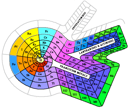 More at 1 nanometerPictured below is a periodic table of the chemical elements -- in a rather unusual form. This unique table is the work of a Professor Benfey. Dimitri Mendeleev is given credit for creating the Period Table of the Elements in which he clearly illustrated the periodic relationship between chemical groups, leaving gaps in his chart predicting the discovering of unknown elements. |