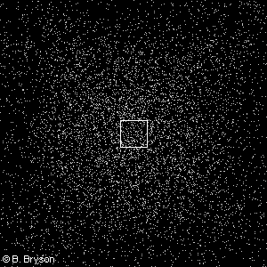 The Inner Electron CloudThis image represents the cloud of charge of the two inner electrons of the carbon atom. As in the previous picture, individual electrons cannot be resolved. Essentially, we are displaying the probability of finding an electron in this cloud of charge. The inner shell of electrons, the p shell, can contain at most two electrons. The closer electrons are to the nucleus, the tighter they are held and the higher the energy required to remove them from the atom. Therefore, the p shell electrons of carbon do not participate in molecular bonding. The nucleus of the carbon atom is one thousand times smaller than the inner shell of electrons. At this scale, the nucleus is smaller than a single pixel. If the whole carbon atom (the previous image) were 100 meters in diameter, the nucleus would be 1 mm in diameter -- 10 000 times smaller. Atoms, the stuff that everything is made from, are mostly empty space!Copyright © 2005-07 by Bruce Bryson |