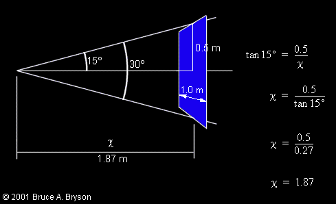 This figure shows the relationship between the observer and the image using a 30° field of view. It applies at any scale -- the 1 meter square is viewed from 2 meters away, the 10 meter square is seen from 20 meters, etc. To return to the previous page, select your browser's Back button. Copyright © 2005 by Bruce Bryson |